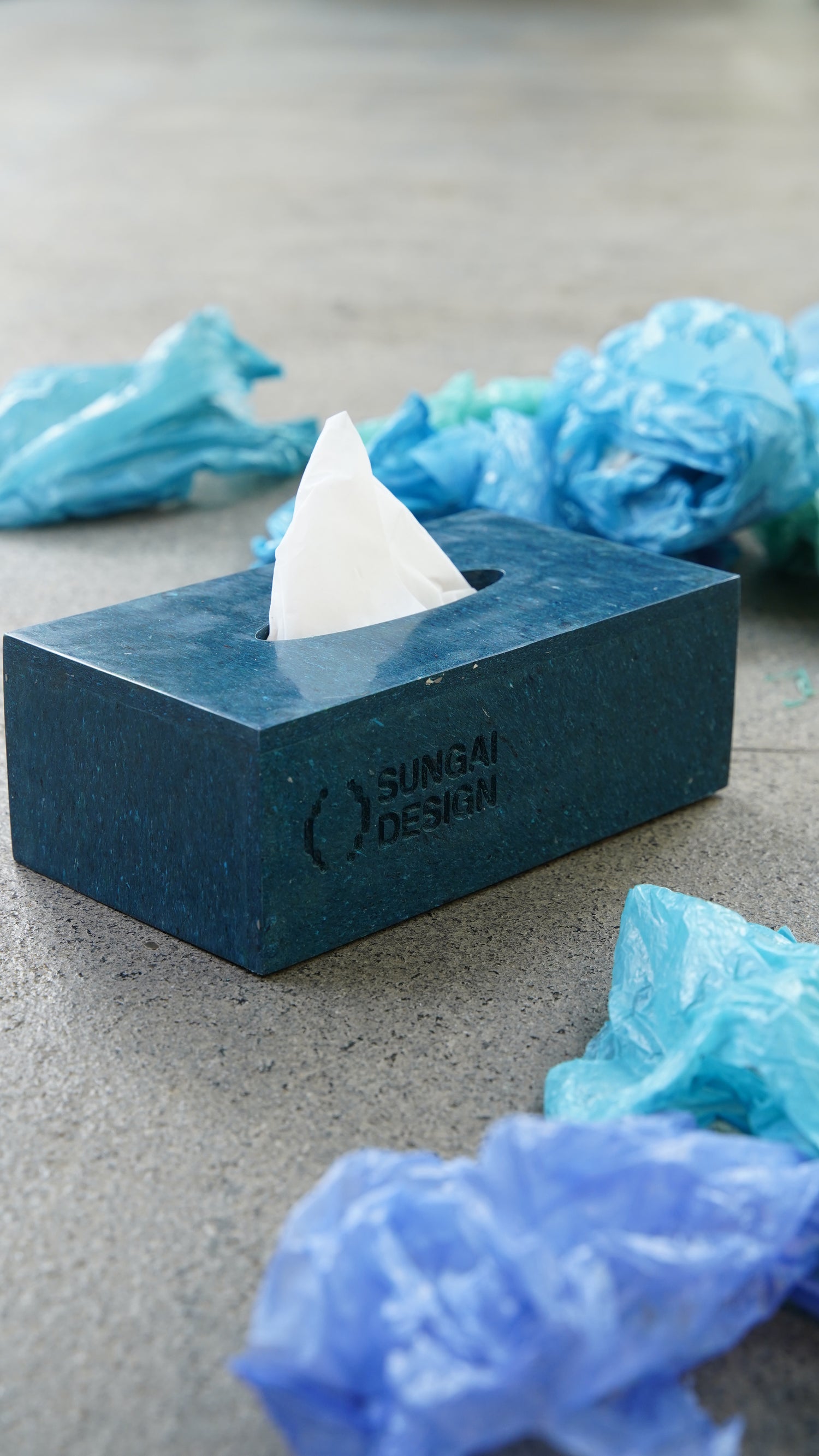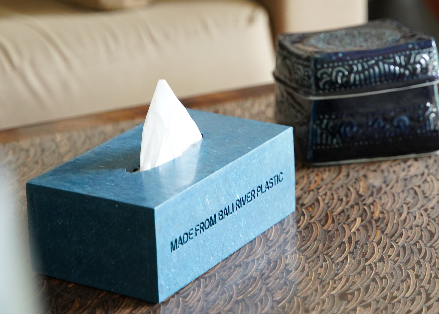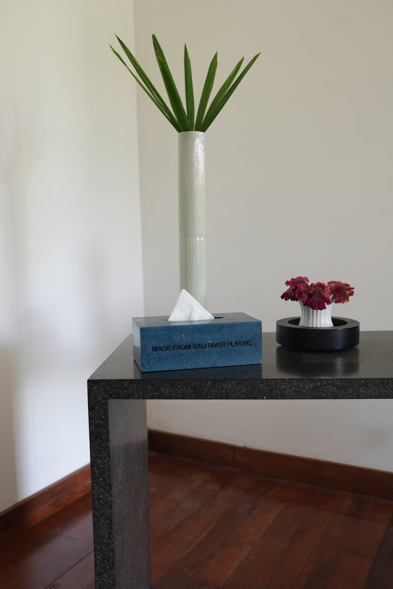 Its clean form and recycled texture elevate it as both a discreet object and a statement piece. Available in four colors, white, black, blue, and green, the Kotak Tissue Box is a small, design-item that’s accessible and will help us on our mission to clean and protect Indonesia’s rivers.