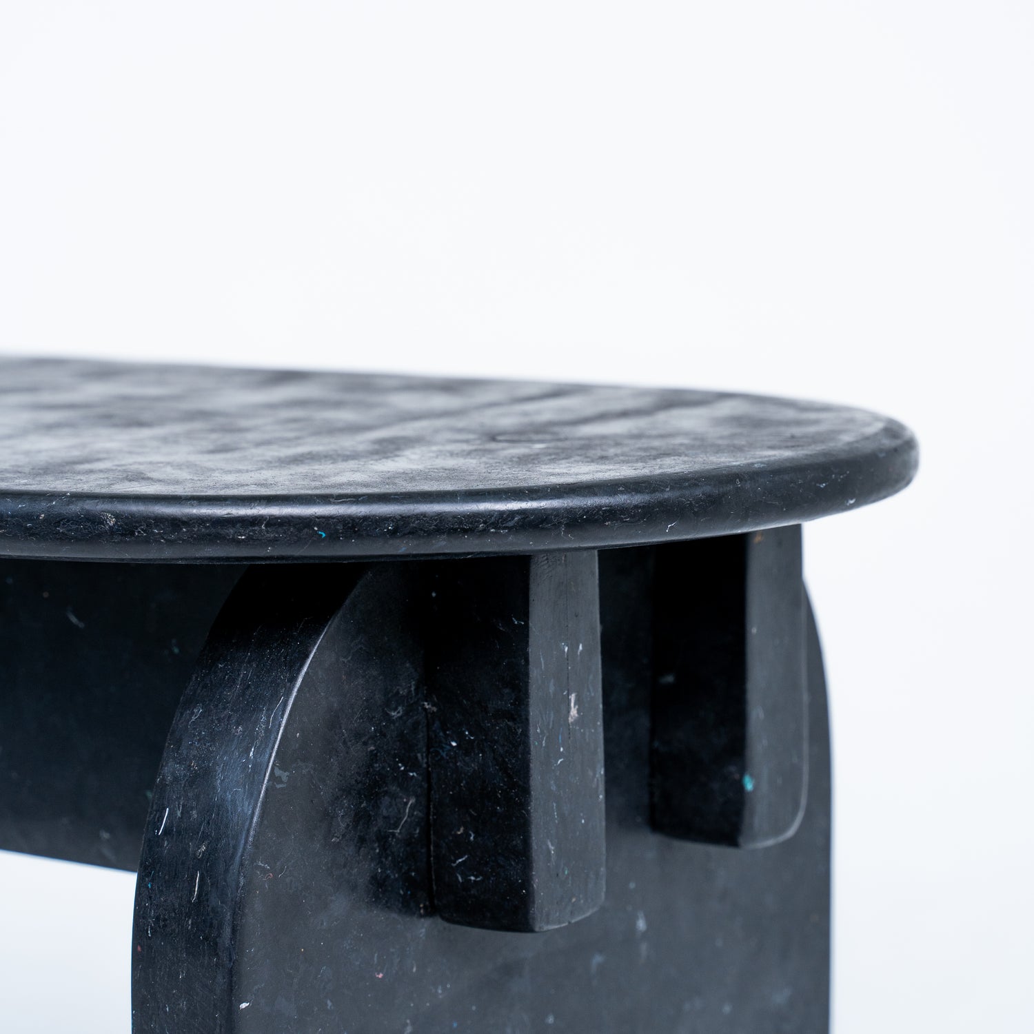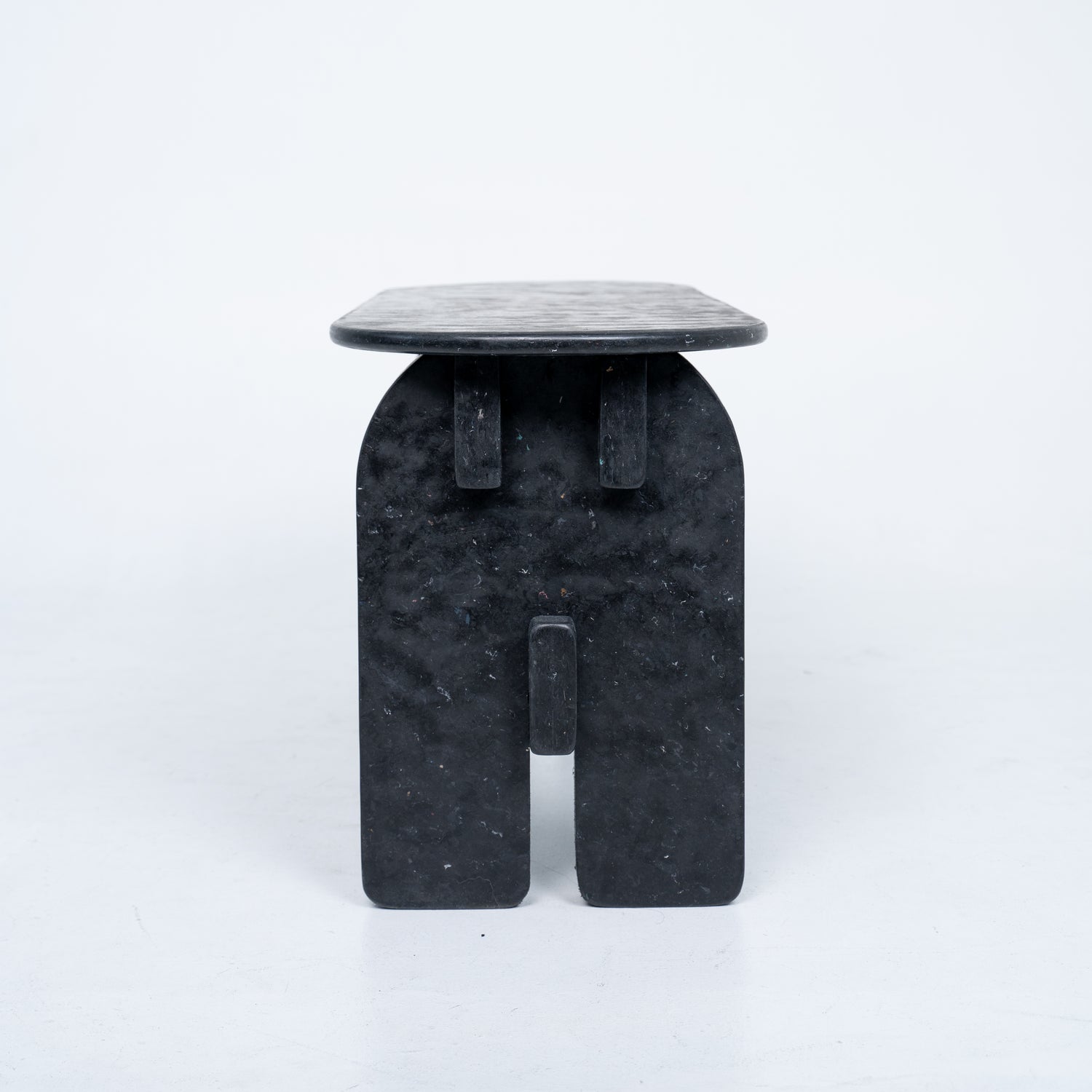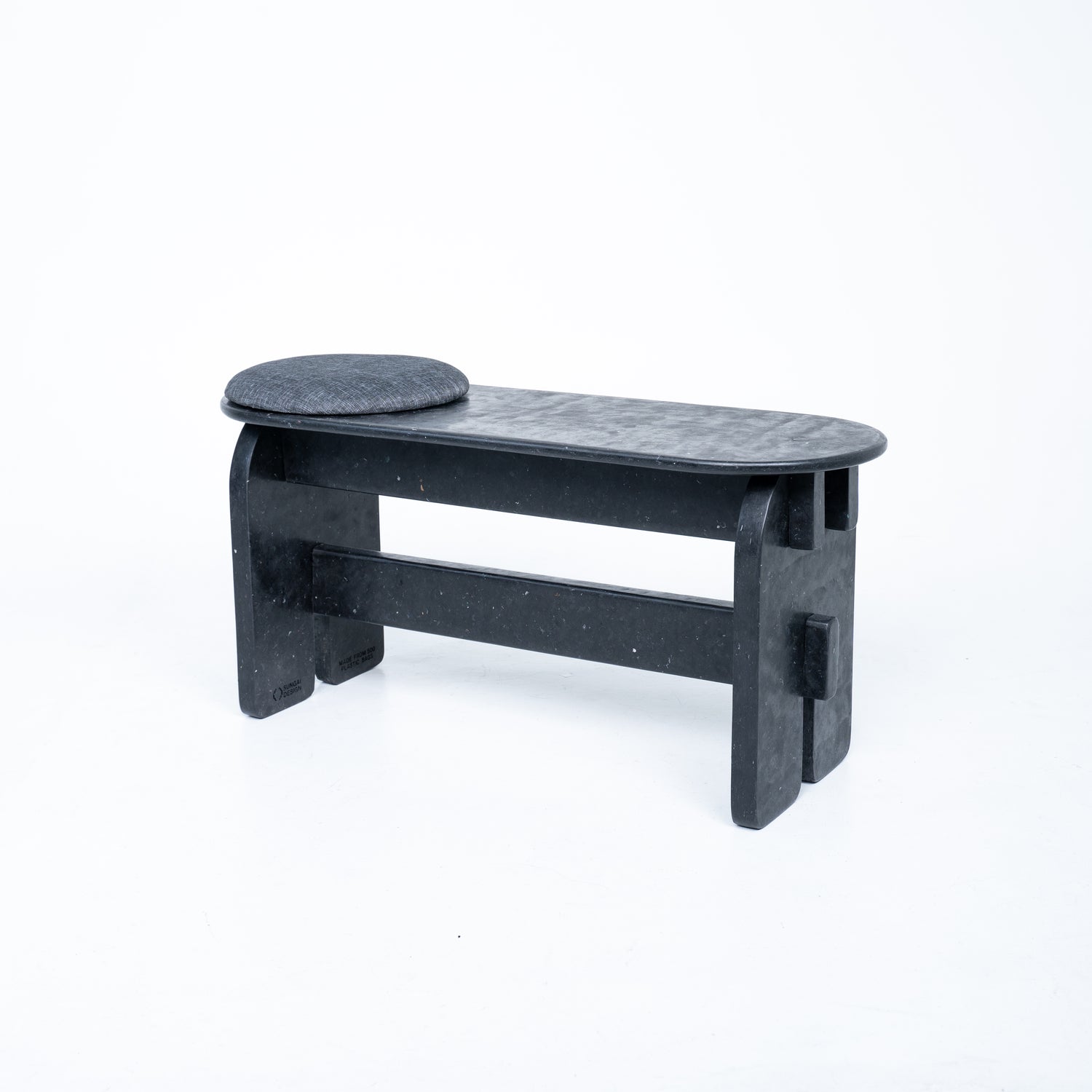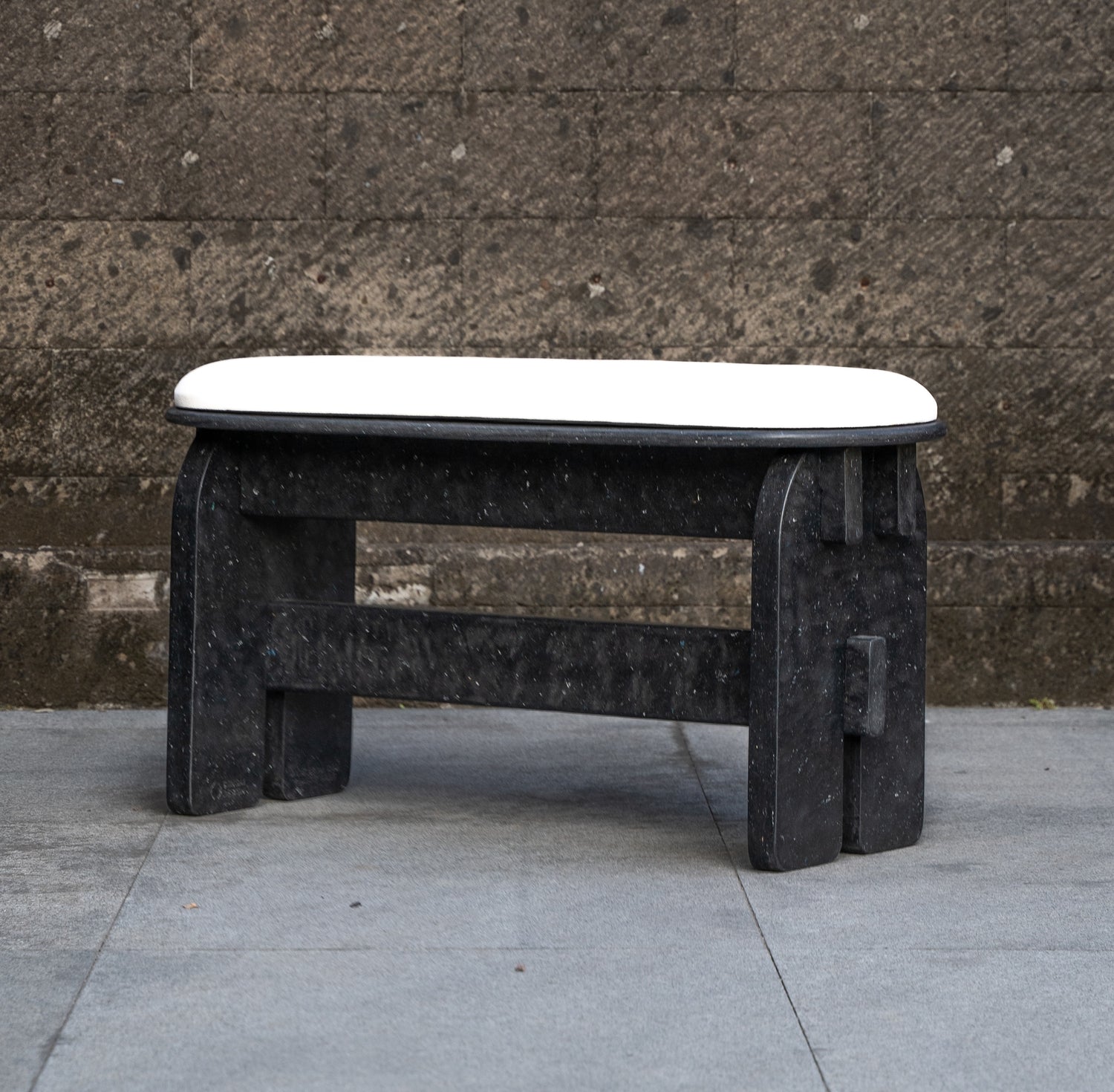 Made from 1,200 up-cycled plastic bags, its rounded top is supported by two sturdy legs joined by a sleek, central bar. Designed for the indoors, the Muara Bench offers a minimalist aesthetic that enhances any space while promoting eco-conscious living.